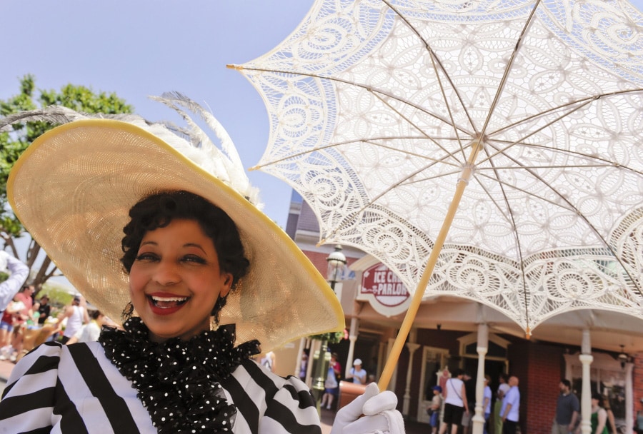 Who would be so bold as to combine stripes and polka-dots? Why, Miss Inga DaPointe, of course – the fashion maven of Main Street, U.S.A. Miss DaPointe also serves as the Fashion Editor of the Main Street Gazette when not adding cheer and fashion guidance to the many Magic Kingdom guests who frequently ask her for autographs and photos.