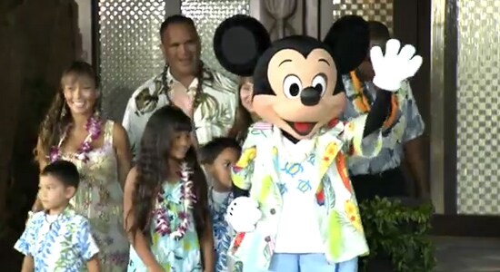 Before checking in, the Mahi family was told that they were named the First Honorary Family and that they would be able to participate in the opening ceremony for Aulani, a Disney Resort and Spa. Afterward, they talked to the Disney Parks Blog about their experience at the new Disney resort. Here they are, checking in alongside Mickey Mouse and Minnie Mouse.