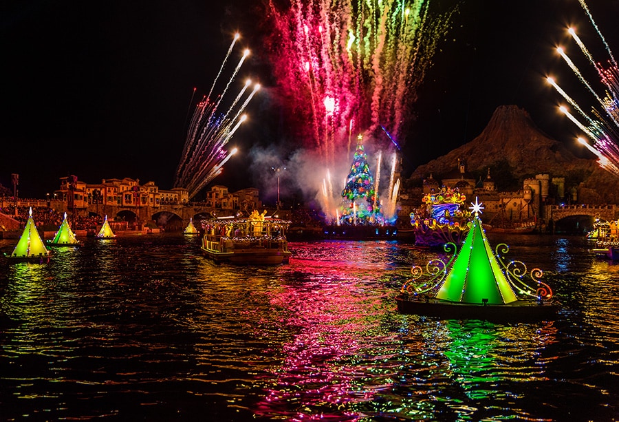 I really liked how the Sorcerer’s Hat barge from from Fantasmic! serves double-duty as a Christmas tree on the water during ‘Christmas Wishes’ at Tokyo Disney Sea.