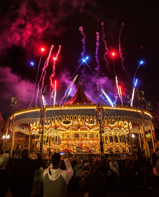 When I say it’s really cool to see fireworks bursting above King Arthur Carrousel in Fantasyland at Disneyland park, I’m not horsing around. Photographing the show brings to mind a few historical facts about the carrousel and why it’s so special: