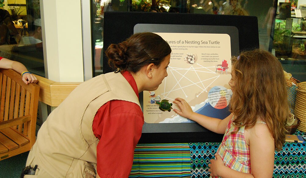 At The Seas with Nemo & Friends, children can climb through a full-size model of a turtle excluder device, used on fishing boats to prevent sea turtles from getting caught in nets. Families also can watch a sea turtle swimming gracefully by in the 5.7-million-gallon saltwater main aquarium, and play games that help them learn about the many threats turtles face, like getting entangled in trash and fishing line.