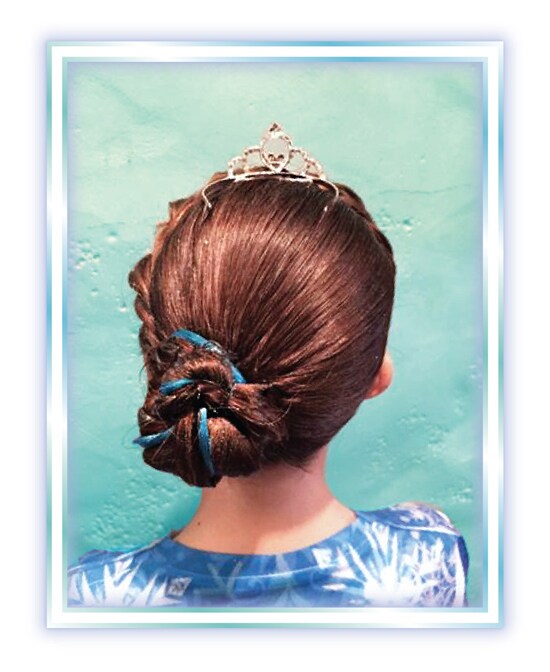 Fans of Elsa will love the twist given to this coronation-inspired braided style, which includes a ‘cool’ blue streak, a tiara and a light applique of makeup and nail polish.