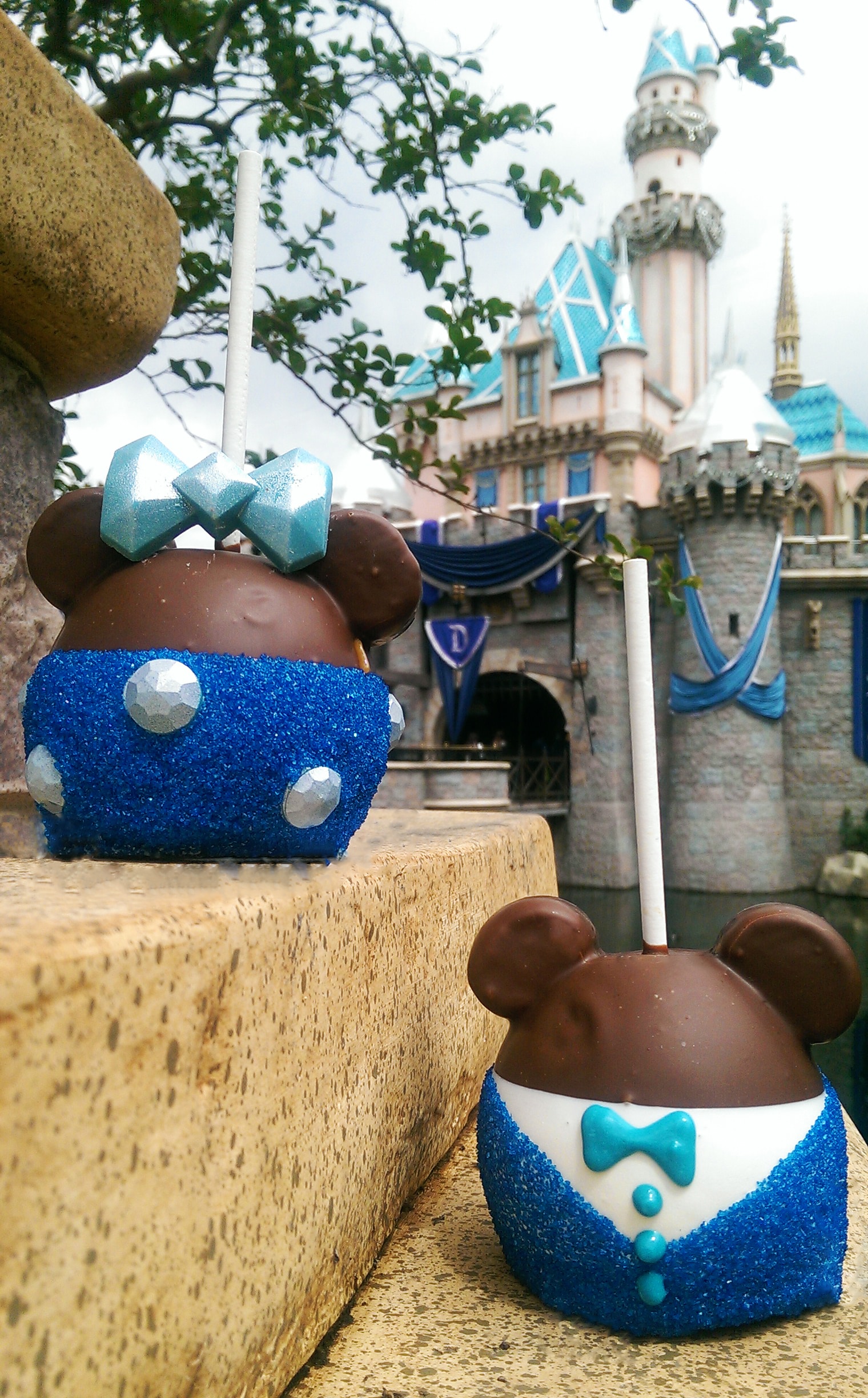 These stunning Mickey Mouse and Minnie Mouse apples are enrobed in caramel, dipped in chocolate and have been dusted in sparkling blue sanding sugar. With final touches of chocolate “gem” buttons and a diamond-shaped bow for Minnie Mouse, these two never looked so delicious.