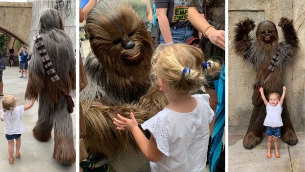 As we continue our countdown to the August 29 official opening of Star Wars: Galaxy’s Edge at Disney’s Hollywood Studios, we wanted to share a special moment between a young Star Wars fan and her all-time favorite Star Wars character – Chewbacca.